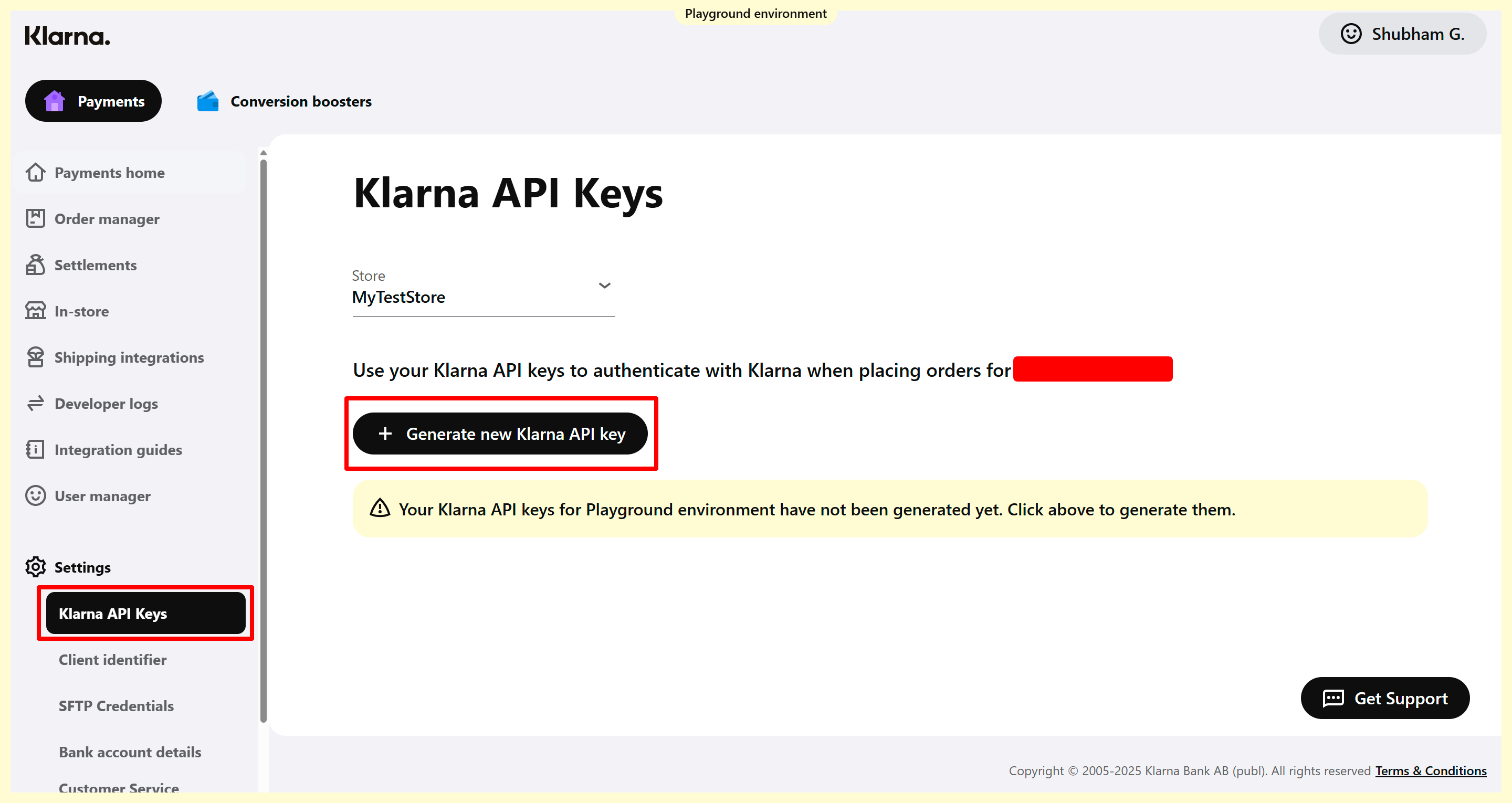 3. Click on Generate new Klarna API key to receive your API credentials. Be sure to download and store them securely